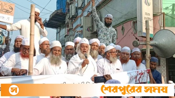 অবৈধ দখলদার ইসরাইলদের অগ্রাসনের বিরুদ্ধে শেরপুরে বিক্ষোভ মিছিল