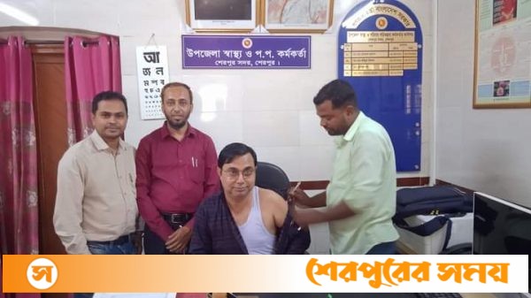 শেরপুরে কোভিড -১৯ টিকার বুষ্টার ডোজ গ্রহণ করলেন সিভিল সার্জন ডাঃ অনুপম ভট্টাচার্য্য। ২৫ মার্চ সোমবার দুপুরে সদর উপজেলা স্বাস্থ্য ও পঃপঃ কর্মকর্তা কার্যালয়ে বুষ্টার ডোজ গ্রহণ সিভিল সার্জন ও নব যোগদান কৃত মেডিকেল অফিসার ডাঃ মোফাজ্জল হোসেন।