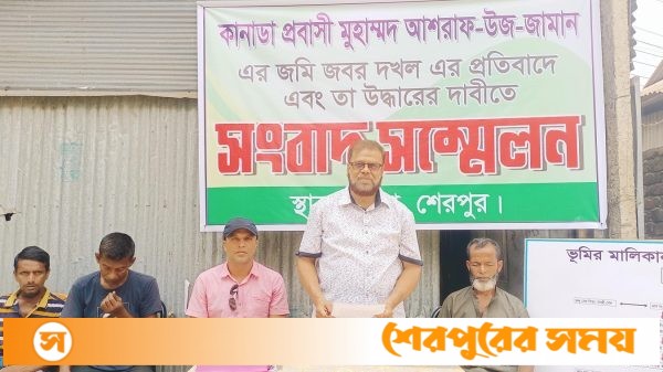 শেরপুরে কানাডাপ্রবাসী এক রেমিটেন্স যোদ্ধার জমি বেদখলের প্রতিবাদে সংবাদ সম্মেলন