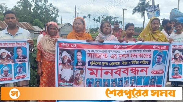 শেরপুরে সাজ্জাত হোসেন হত্যাকাণ্ডের আসামিদের গ্রেপ্তার ও ফাঁসির দাবিতে মানববন্ধন ও বিক্ষোভ